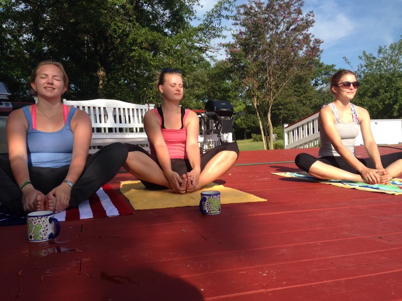 Judith, Sabine and Anna on the pool deck for morning yoga.