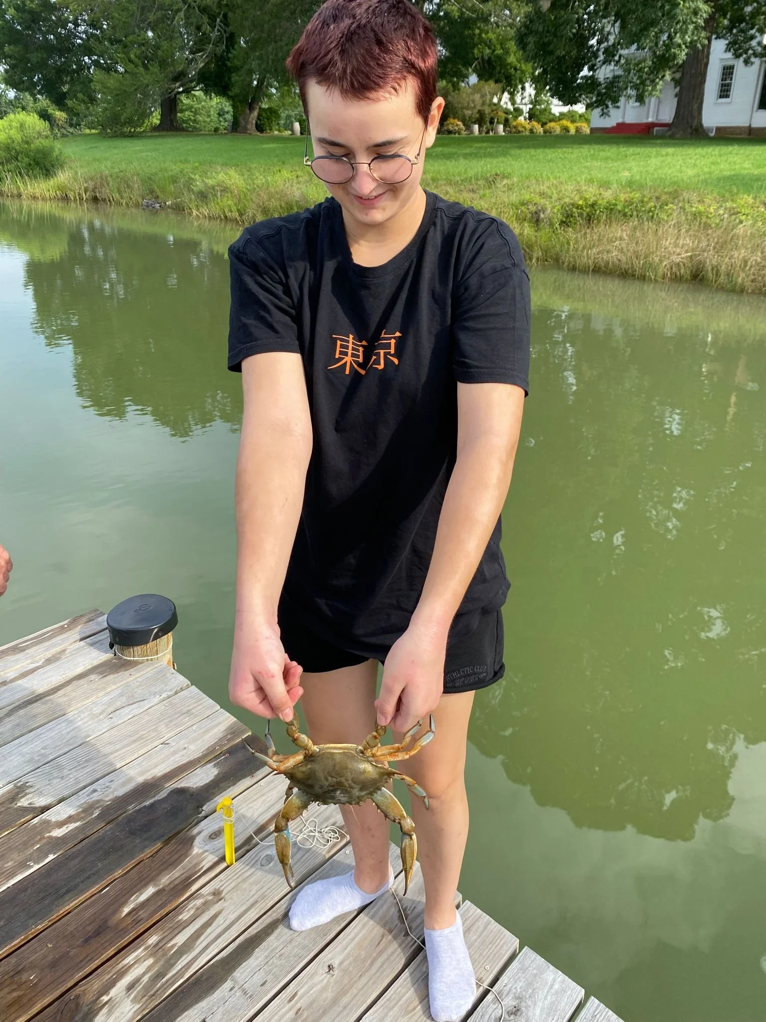 Toby holding a Maryland Blue Crab with only one claw. Mindy, our 2023 Slack Fellow in Residence and a Maryland native, is watching from behind.