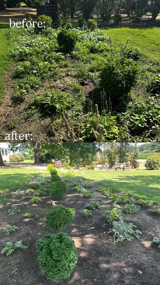The garden was obscured by weeds, and as we pruned and weeded, the most lovely boxwood and hosta garden emerged.