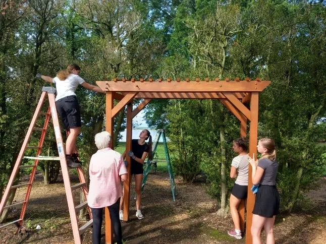 Selina on the ladder, removing some of the slats and guiding the end into a pocket between boxwood limbs.