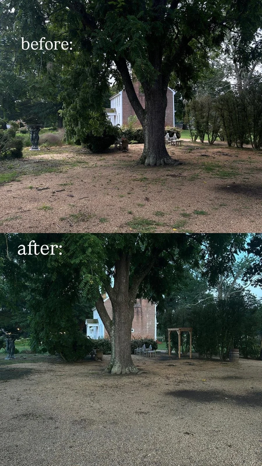 Before: Weeds detract from an otherwise nice stretch of pebbled walkway. After: Lovely how the Walnut tree now seems so much more open! Notice also we’re getting ready to set an arch into the landscape!