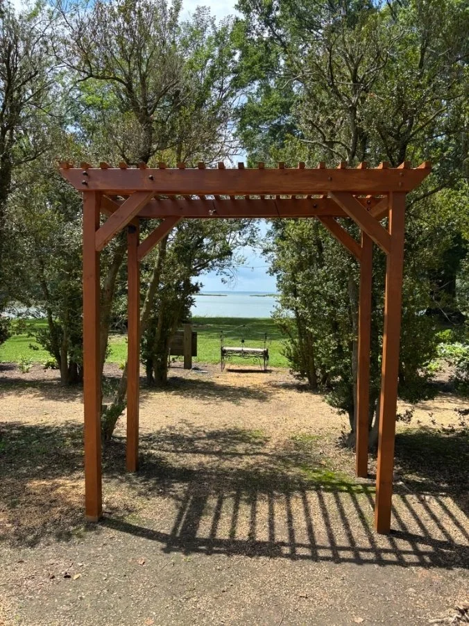 And the Cedar-stained wedding arch from Madelyn and Ethan’s wedding, positioned to be set into the Boxwood Allée. The view looks promising!